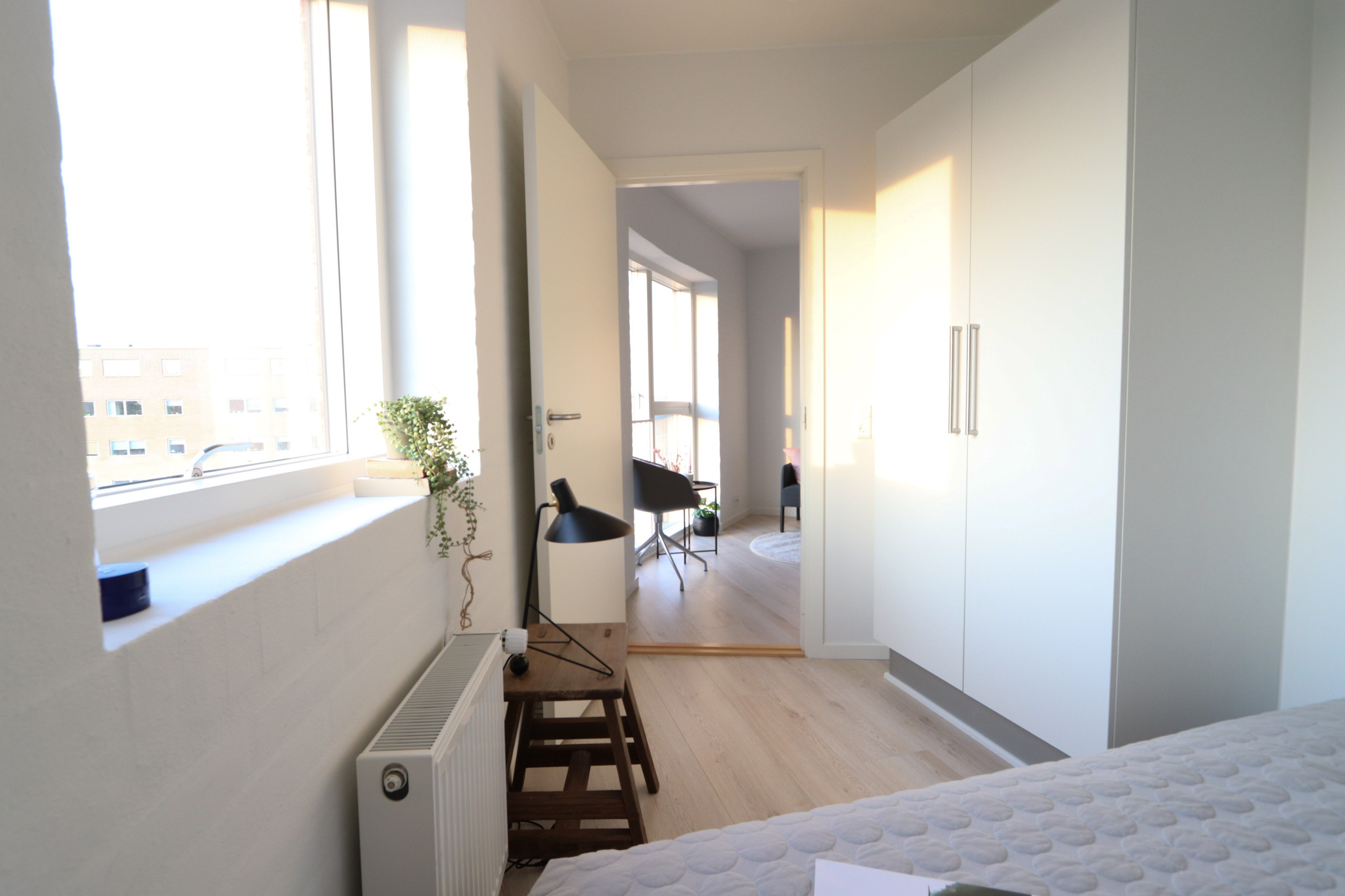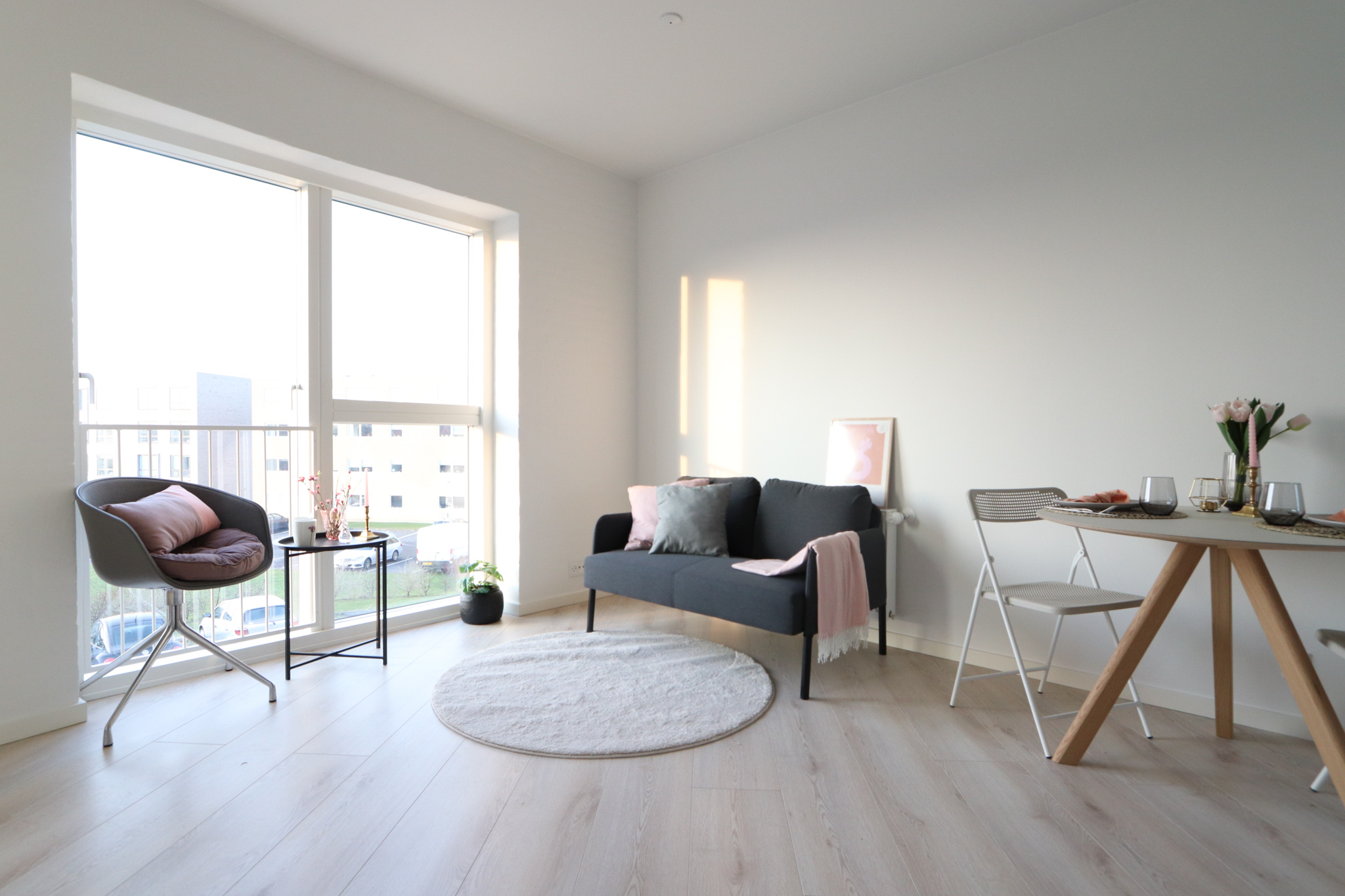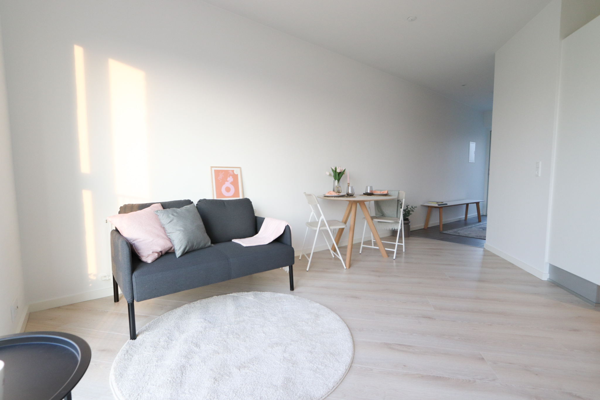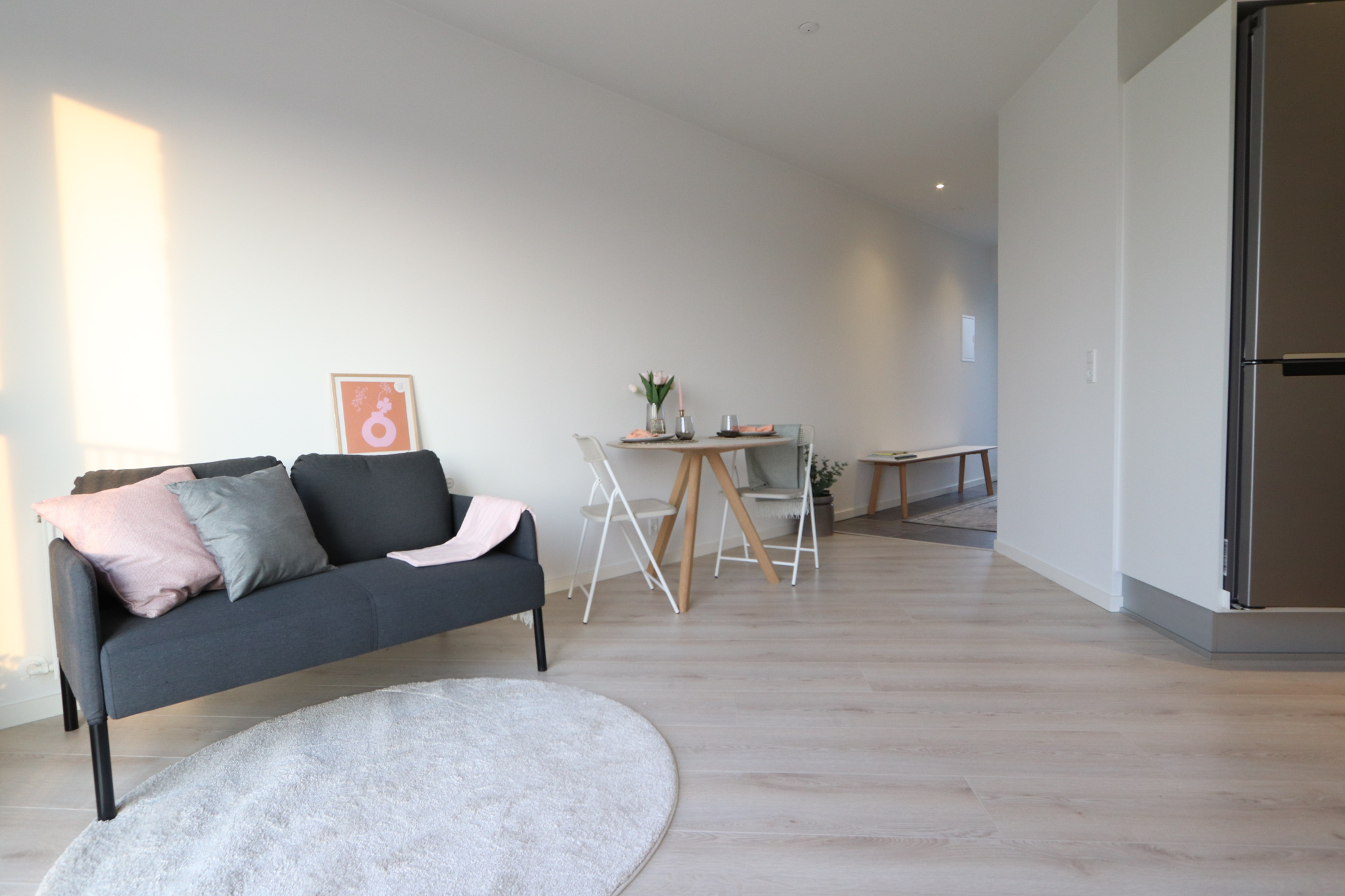 Der er lyse træ-lignende gulve i både stue/alrum og på værelset.