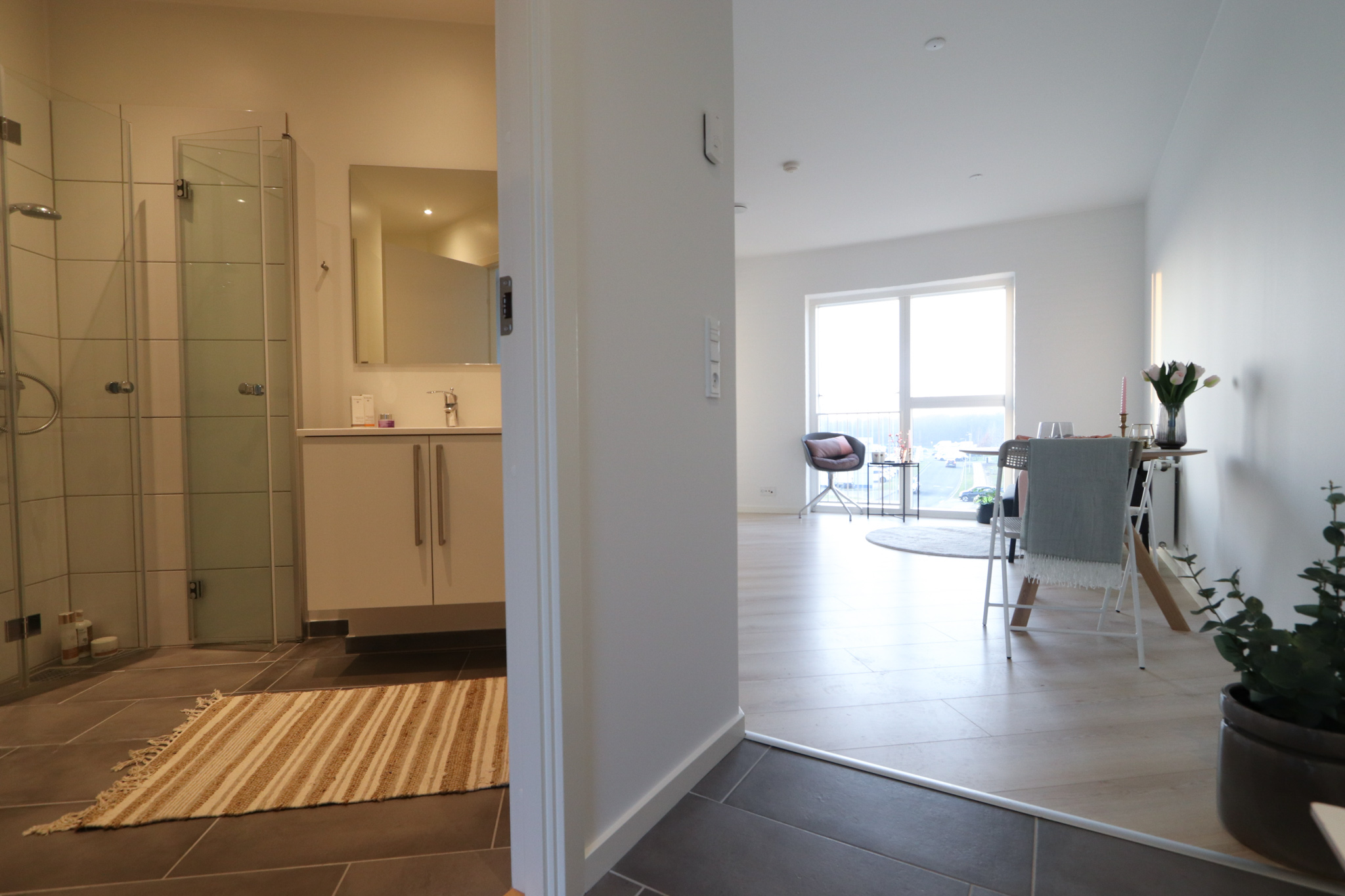 Indeholder lys entré med klinker, med direkte adgang til badeværelse og køkken/alrum/stue.